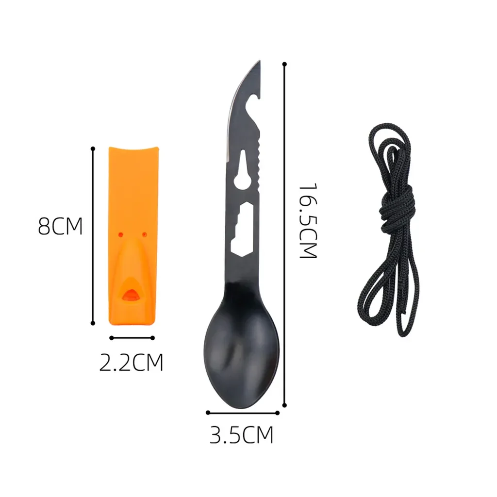 - Multifunktionales Tool: Reislöffel, Messer, Harpune, Flaschenöffner, Fischschuppenmesser, Nagelentferner, Sechskantschlüssel und Überlebenspfeife.