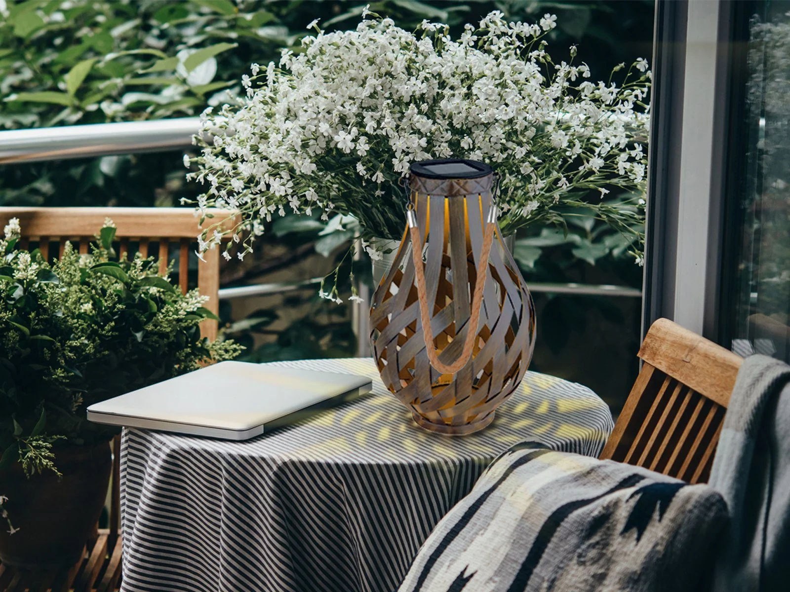 - Flexible Nutzung: wahlweise hängend am Bambusseil oder stehend, etwa auf Tischen oder Mauern.