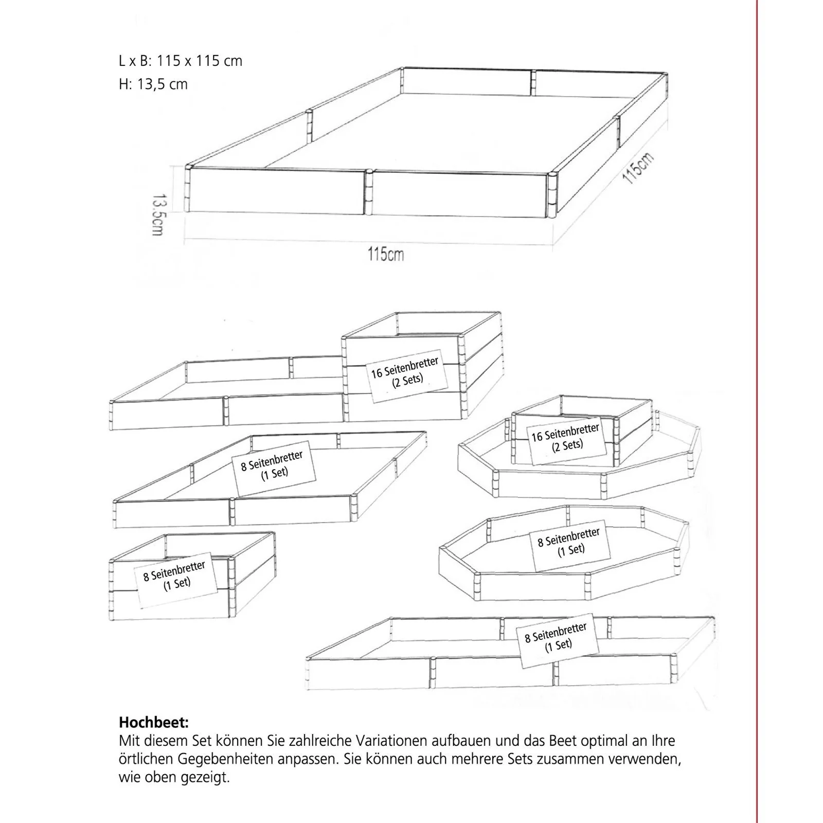 | Maße Hochbeet (einfache Höhe) | 115 x 115 x 13 cm |
