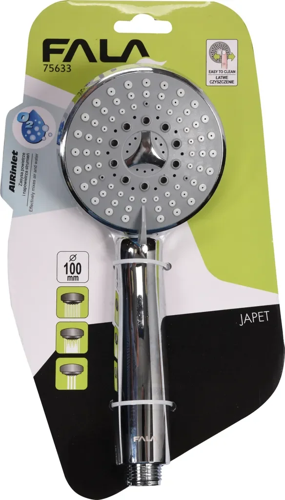 Die Japet Duschhandbrause von Fala kombiniert wassersparende Technik mit angenehmem Strahlkomfort. Das leichte Gehäuse aus ABS-Kunststoff liegt gut in der Hand, während die verchromte, glänzende Oberfläche robust wirkt und gegen Abblättern resistent ist. Dank AIRinlet-Technologie wird Luft in den Duschkopf gesaugt und mit Wasser vermischt, wodurch das Sprühvolumen steigt. Drei wählbare Strahlarten und pflegeleichte Silikondüsen runden die Handbrause für Badewanne und Duschkabine ab.