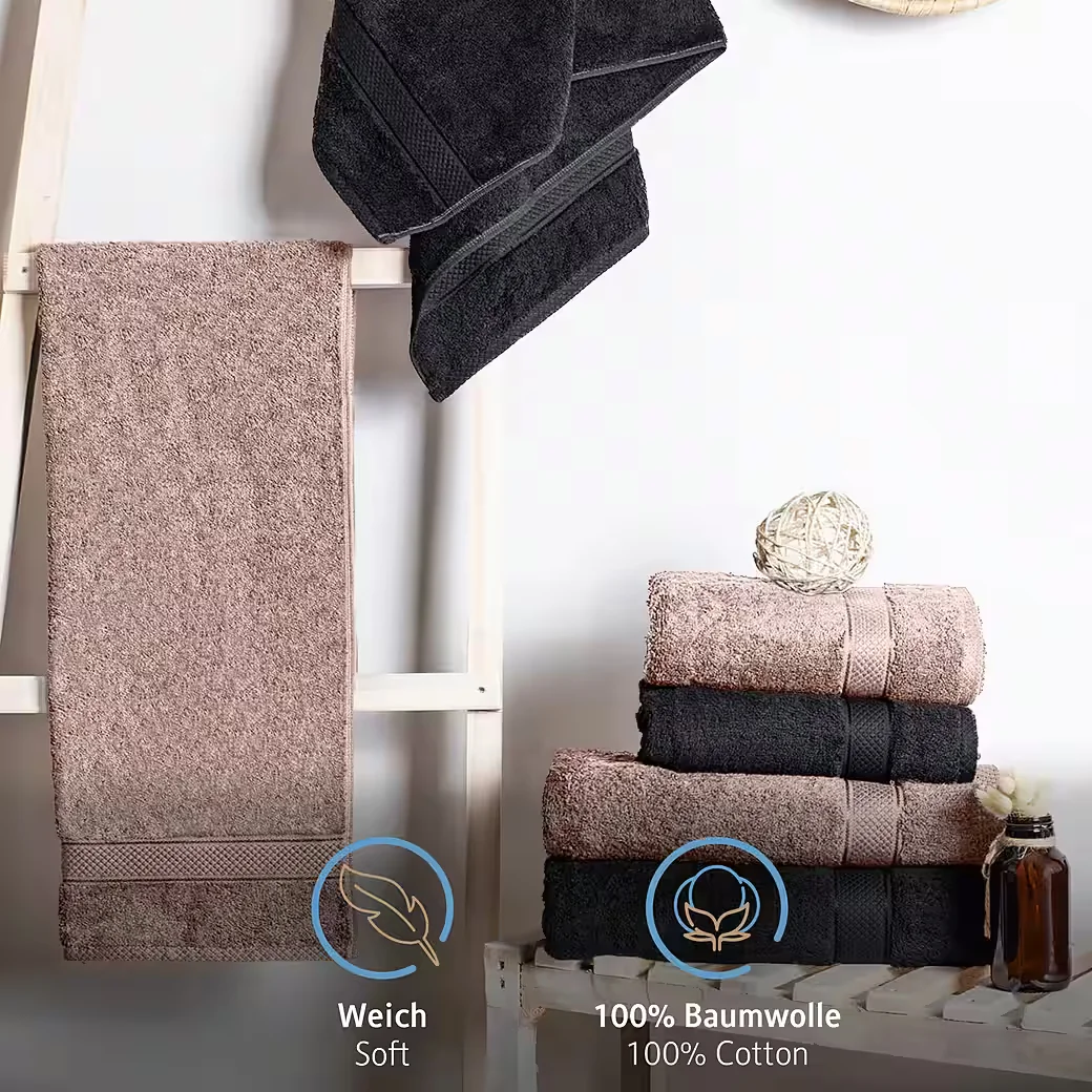 Das 4-teilige Komfortec Handtuch-Set in Schwarz und Rosa kombiniert weiches Frottee aus 100% Baumwolle mit alltagstauglicher Robustheit. Die Tücher im Format 50 x 100 cm überzeugen durch hautfreundliche, flauschige Haptik und hohe Saugkraft. Mit einem Flächengewicht von 470 g/m² und zwei eingewebten Bordüren stehen sie für dichte Qualität und einen klaren, unifarbenen Look. Die nach OEKO-TEX Standard 100 zertifizierte Verarbeitung bestätigt die schadstoffgeprüfte Qualität.