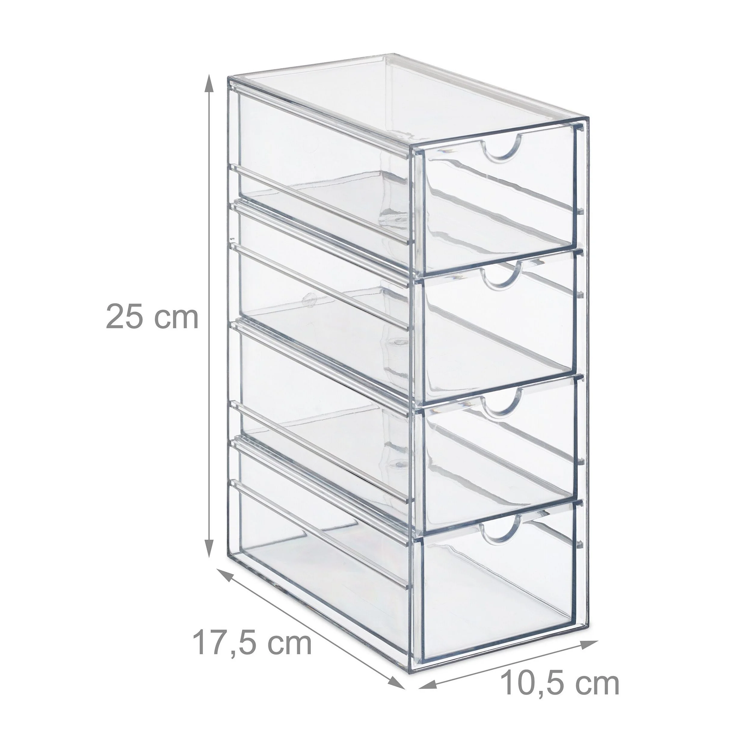 Die transparente Schubladenbox von Relaxdays bringt Struktur auf Schminktisch, Schreibtisch oder in die Bastelecke. Der kompakte Mini‑Organizer aus pflegeleichtem PET‑Kunststoff bietet vier übereinander angeordnete Fächer und schafft auf wenig Stellfläche zusätzlichen Stauraum. Dank klarer Fronten bleibt der Inhalt sofort erkennbar, während sich die einzelnen Schubladen über die integrierte Griffmulde leicht herausziehen lassen. Für Kosmetik, Stifte, Büroklammern, Nähutensilien und ähnliches Kleinzubehör geeignet.